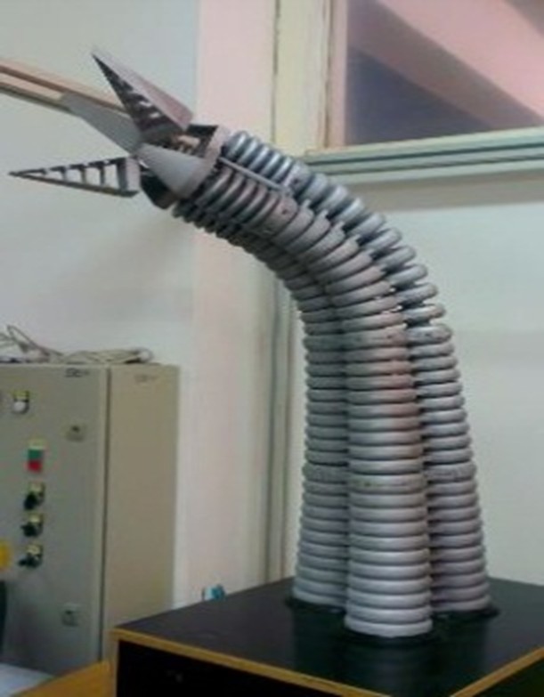 In Figura 16 este prezentat robotul HIDRA, realizat dintr-o succesiune de 3 module, fiecare alcătuit din segmente elastice circulare, capabile să execute mișcări flexibile pe multiple direcții. Structura sa permite deformări continue, fiind adecvat pentru cercetări în domeniul soft robotics.
